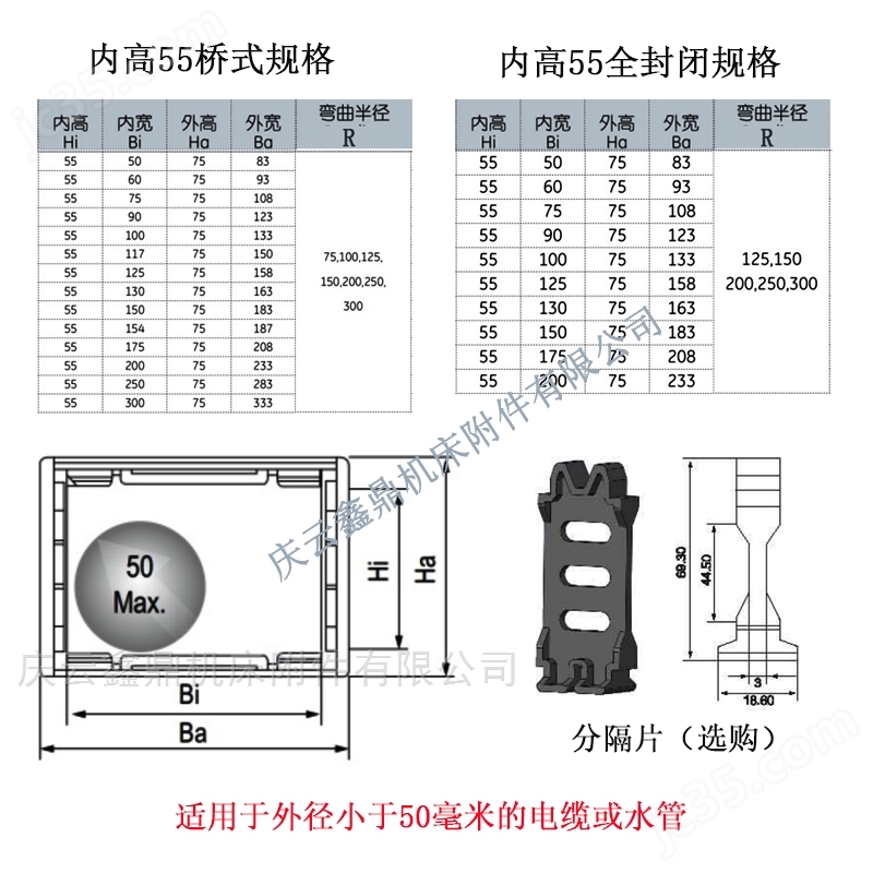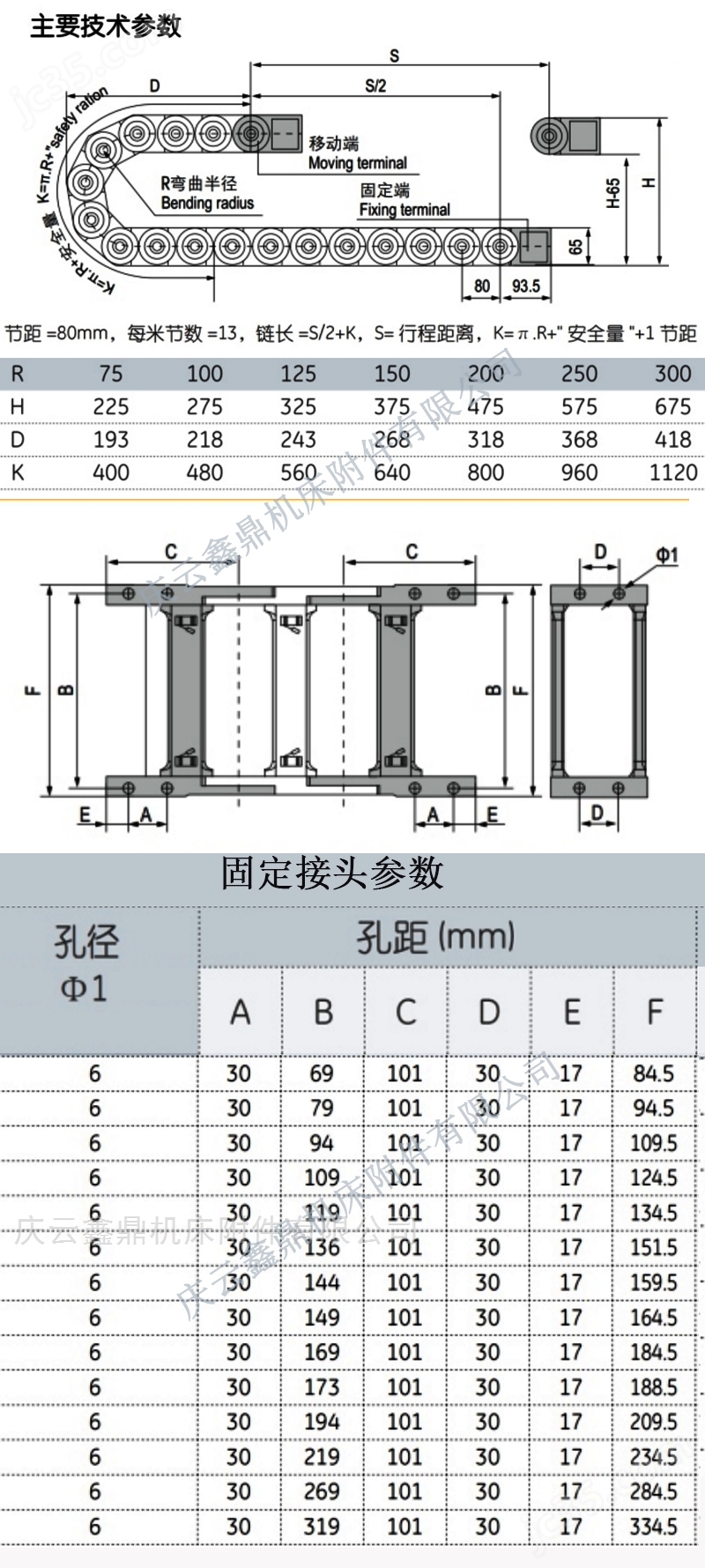 坦克链外形:由众多单元链接组成,链接之间转动自如,系列化参数:相同系列的拖链内高、外高、节距相同,内宽和弯曲半径R可有不同选择