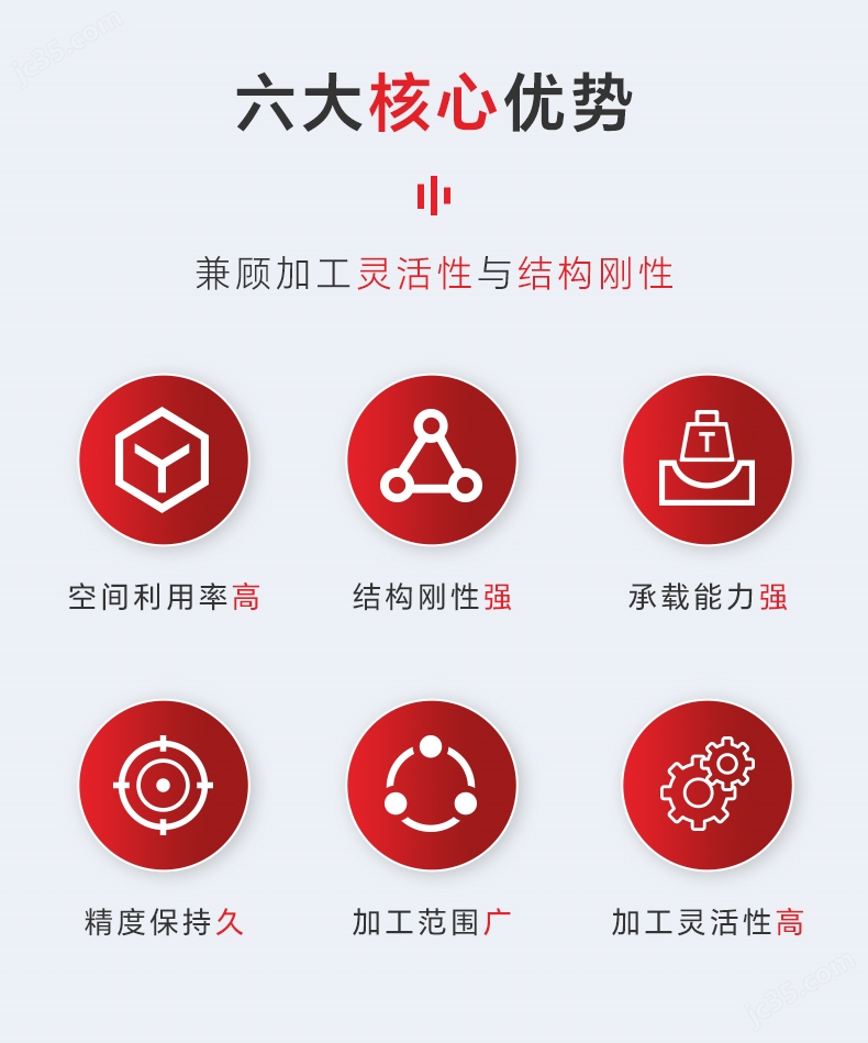 采用双柱同步驱动的定梁动柱结构,底座与立柱加宽加厚,整体刚性提升显著。