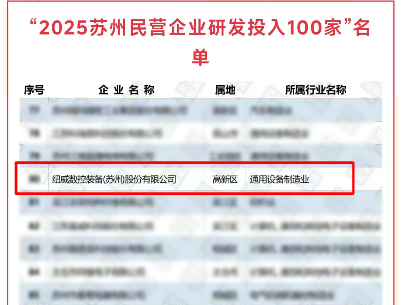 【钱柜qg777栏目 名企在线】近日,苏州市首次发布“2025苏州民营企业研发投入100家”榜单,纽威数控成功入选。