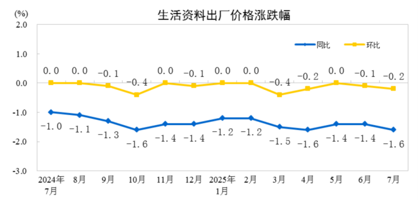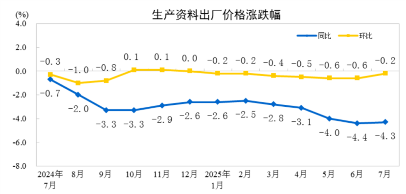 【钱柜qg777栏目 市场分析】2025年7月份,全国工业生产者出厂价格环比下降0.2%,工业生产者购进价格环比下降0.3%,降幅比上月分别收窄0.2个和0.4个百分点。工业生产者出厂价格同比下降3.6%,工业生产者购进价格同比下降4.5%。1—7月平均,工业生产者出厂价格比上年同期下降2.9%,工业生产者购进价格下降3.2%。