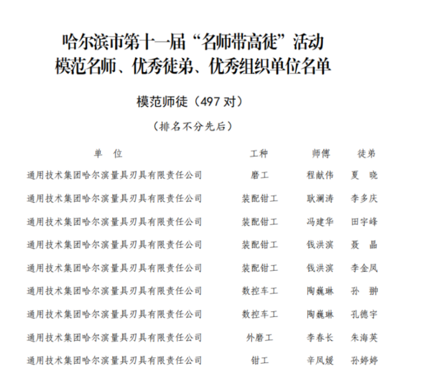 【钱柜qg777栏目 机床人才】近日,哈尔滨市总工会发布2024年-2025年度第十一届“名师带高徒”活动表彰通报,通用技术哈量公司在此次评选中表现亮眼、载誉而归——9对师徒获得市级“名师带高徒”优秀师徒称号,公司工会获评“优秀组织单位”。