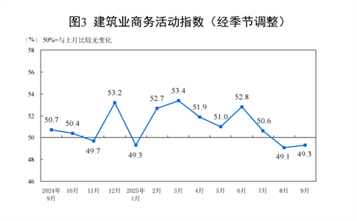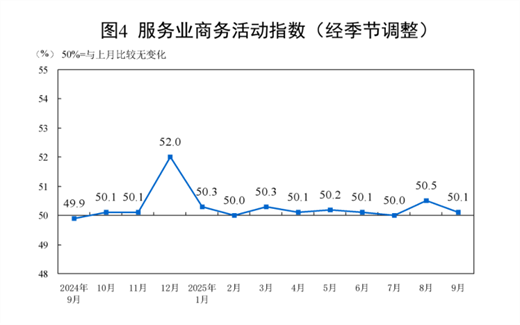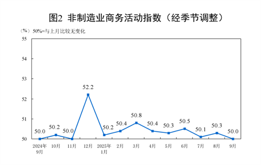 9月份,非制造业商务活动指数为50.0%,比上月下降0.3个百分点,位于临界点,非制造业业务总量总体稳定。