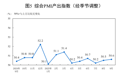 9月份,综合PMI产出指数为50.6%,比上月上升0.1个百分点,持续高于临界点,表明我国企业生产经营活动总体扩张继续加快。